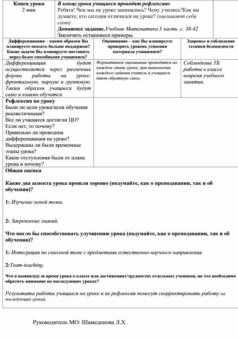 В конце урока учащиеся проводят рефлексию: Ребята! Чем мы на уроке занимались? Чему учились?Как вы думаете, кто сегодня отличился на уроке? (оценивают себя сами) Домашнее задание.Учебник Математика 3 часть. с. 38-42 Закончить оставшиеся примеры. |