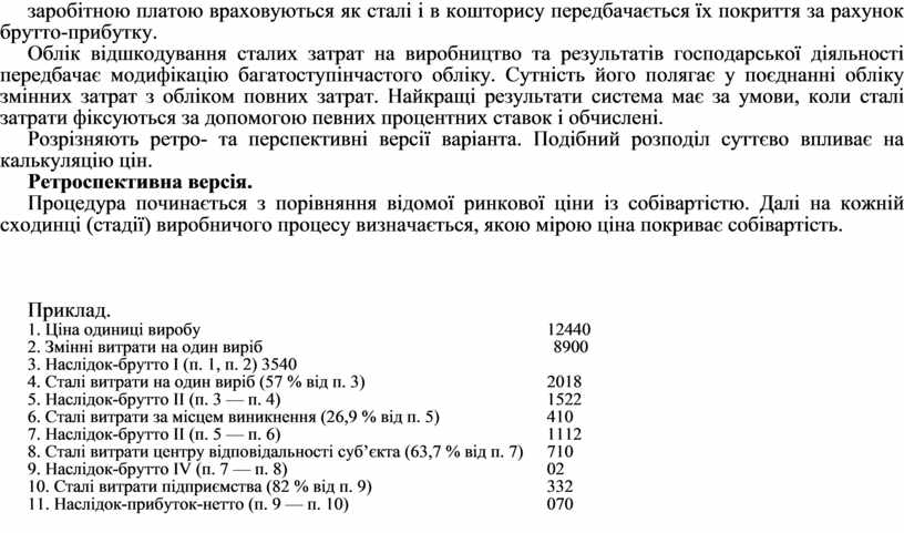 1) віднесенням сталих затрат на конкретні види готової продукції (за групами, місцем виникнення, центрами відповідальності, а також за підприємством як єдиним комплексом);