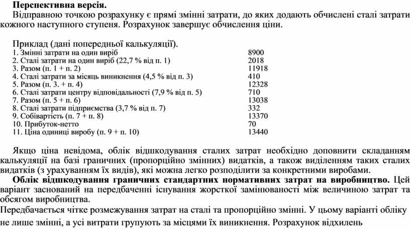 Якщо ціна невідома, облік відшкодування сталих затрат необхідно доповнити складанням калькуляції на базі граничних (пропорційно змінних) видатків, а також виділенням таких сталих видатків (з урахуванням їх видів), які можна легко розподілити за конкретними виробами.