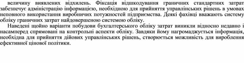 Передбачається чітке розмежування затрат на сталі та пропорційно змінні. У цьому варіанті обліку не лише змінні, а усі витрати групують за місцями їх виникнення. Розрахунок відхилень виконується так само, як при нормативному обліку затрат, тобто з використанням еластичного кошторису (бюджету). Суму фактичних затрат знаходимо коригуванням нормативних витрат на величину виявлених відхилень. Фіксація відшкодування граничних стандартних затрат забезпечує адміністрацію інформацією, необхідною для прийняття управлінських рішень в умовах неповного використання виробничих потужностей підприємства. Деякі фахівці вважають систему обліку граничних затрат найдовершеною системою обліку.