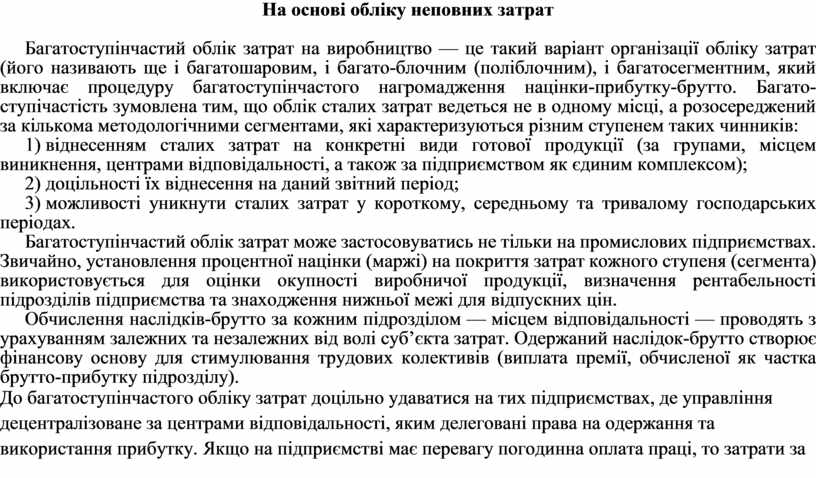 До багатоступінчастого обліку затрат доцільно удаватися на тих підприємствах, де управління децентралізоване за центрами відповідальності, яким делеговані права на одержання та використання прибутку. Якщо на підприємстві має перевагу погодинна оплата праці, то затрати за заробітною платою враховуються як сталі і в кошторису передбачається їх покриття за рахунок брутто-прибутку.