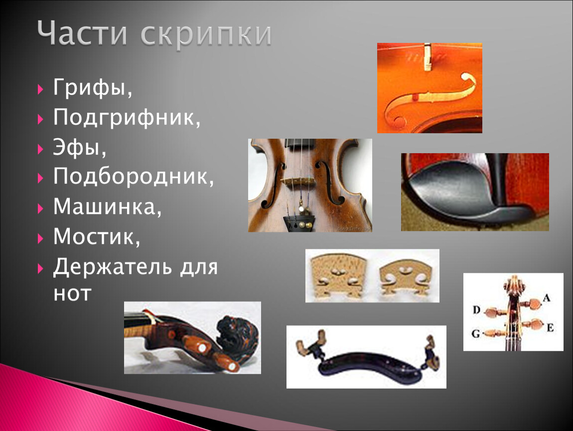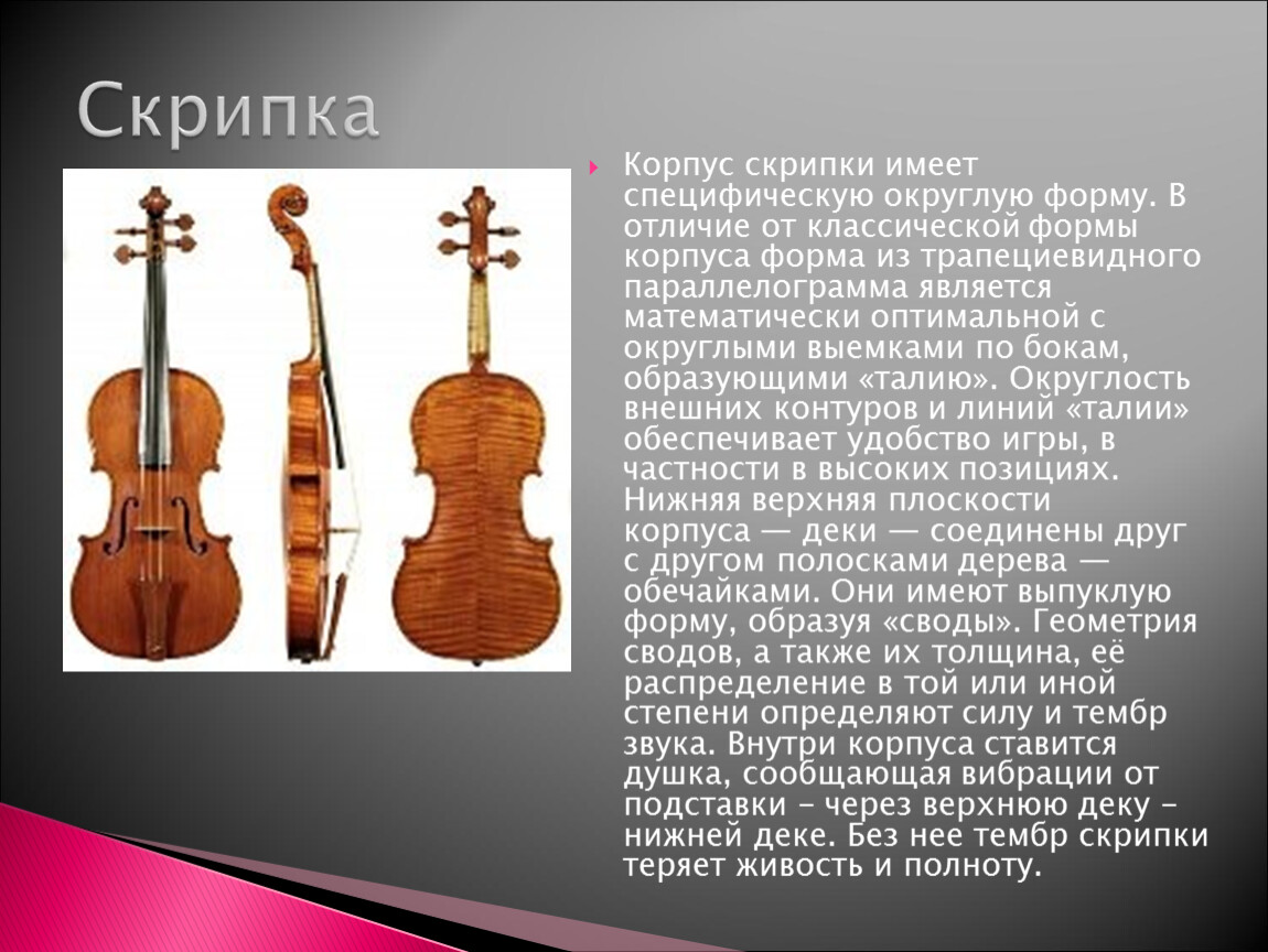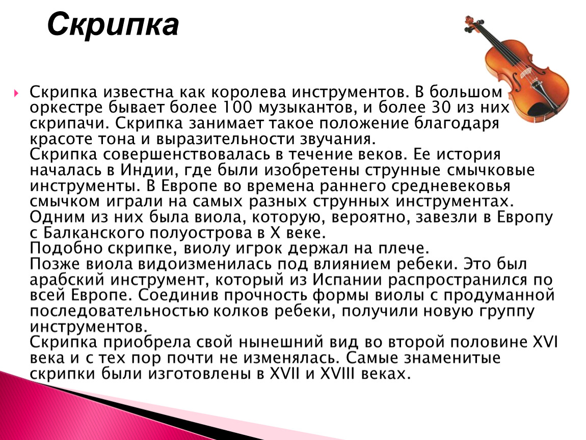 Скрипка известна как королева инструментов. В большом оркестре бывает более 100 музыкантов, и более 30 из них - скрипачи. Скрипка занимает такое положение благодаря красоте тона и выразительности звучания.Скрипка совершенствовалась в течение веков. Ее история началась в Индии, где были изобретены струнные смычковые инструменты. В Европе во времена раннего средневековья смычком играли на самых разных струнных инструментах.Одним из них была виола, которую, вероятно, завезли в Европу с Балканского полуострова в X веке.Подобно скрипке, виолу игрок держал на плече.Позже виола видоизменилась под влиянием ребеки. Это был арабский инструмент, который из Испании распространился по всей Европе. Соединив прочность формы виолы с продуманной последовательностью колков ребеки, получили новую группу инструментов.Скрипка приобрела свой нынешний вид во второй половине XVI века и с тех пор почти не изменялась. Самые знаменитые скрипки были изготовлены в XVII и XVIII веках.