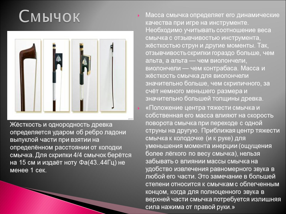«Положение центра тяжести смычка и собственная его масса влияют на скорость поворота смычка при переходе с одной струны на другую. Приближая центр тяжести смычка к колодочке (и к руке) для уменьшения момента инерции (ощущения более лёгкого по весу смычка), нельзя забывать о влиянии массы смычка на удобство извлечения равномерного звука в любой его части. Это замечание в большей степени относится к смычкам с облегченным концом, когда для полноценного звука в верхней части смычка потребуется излишняя сила нажима от правой руки.»