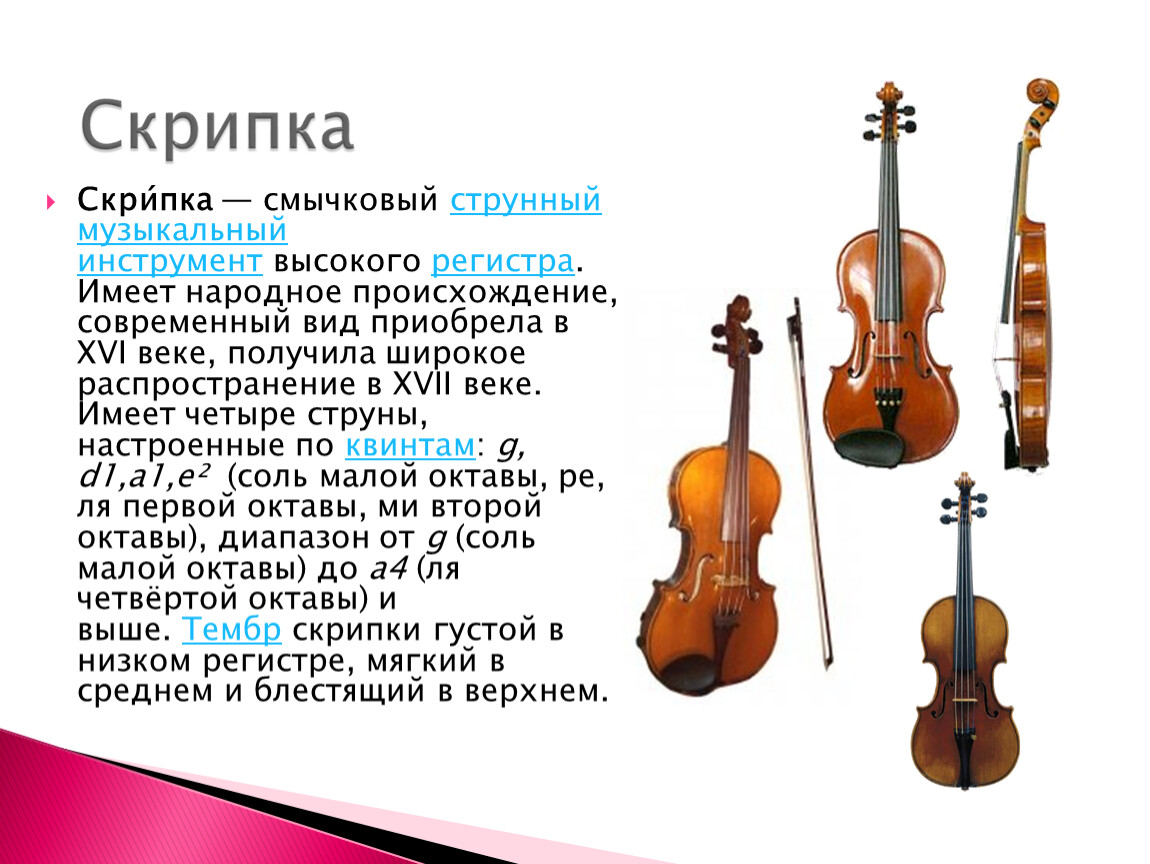 Скри́пка — смычковый струнный музыкальный инструмент высокого регистра. Имеет народное происхождение, современный вид приобрела в XVI веке, получила широкое распространение в XVII веке. Имеет четыре струны, настроенные по квинтам: g, d1,a1,e² (соль малой октавы, ре, ля первой октавы, ми второй октавы), диапазон от g (соль малой октавы) до a4 (ля четвёртой октавы) и выше. Тембр скрипки густой в низком регистре, мягкий в среднем и блестящий в верхнем.
