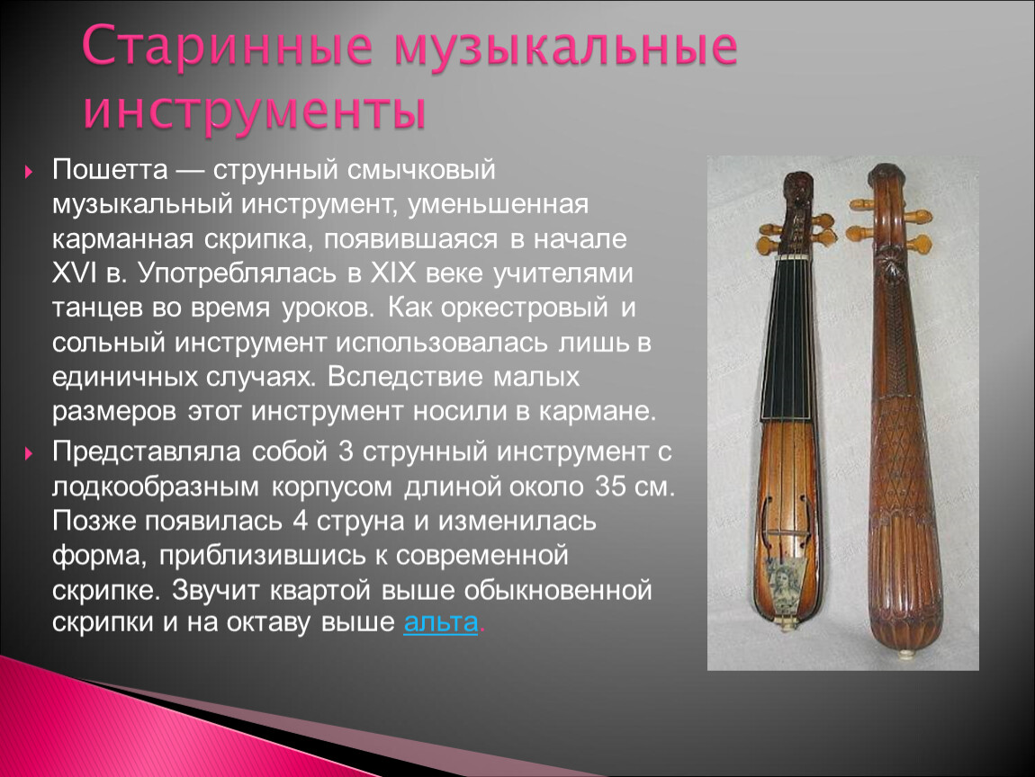 Пошетта — струнный смычковый музыкальный инструмент, уменьшенная карманная скрипка, появившаяся в начале XVI в. Употреблялась в XIX веке учителями танцев во время уроков. Как оркестровый и сольный инструмент использовалась лишь в единичных случаях. Вследствие малых размеров этот инструмент носили в кармане.