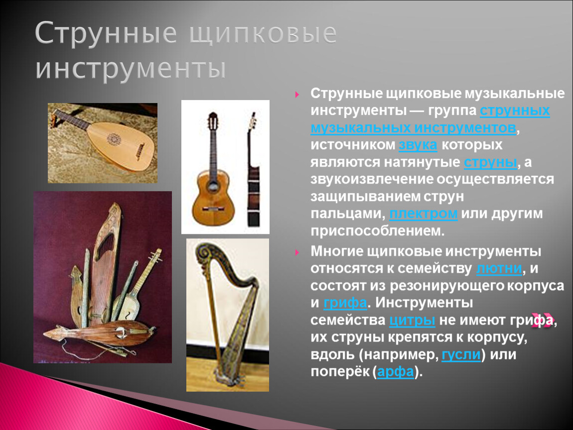 Многие щипковые инструменты относятся к семейству лютни, и состоят из резонирующего корпуса и грифа. Инструменты семейства цитры не имеют грифа, их струны крепятся к корпусу, вдоль (например, гусли) или поперёк (арфа).
