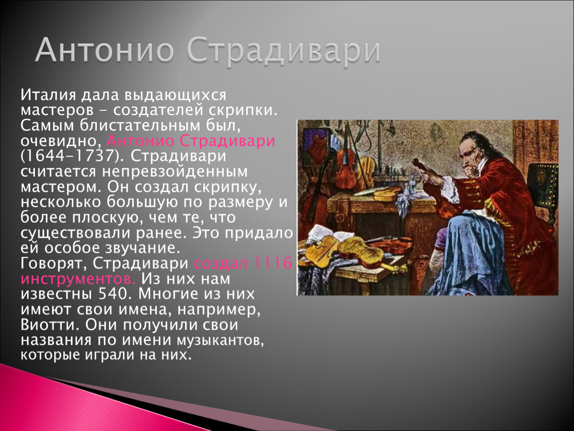 Италия дала выдающихся мастеров - создателей скрипки. Самым блистательным был, очевидно, Антонио Страдивари (1644-1737). Страдивари считается непревзойденным мастером. Он создал скрипку, несколько большую по размеру и более плоскую, чем те, что существовали ранее. Это придало ей особое звучание.Говорят, Страдивари создал 1116 инструментов. Из них нам известны 540. Многие из них имеют свои имена, например, Виотти. Они получили свои названия по имени музыкантов, которые играли на них.