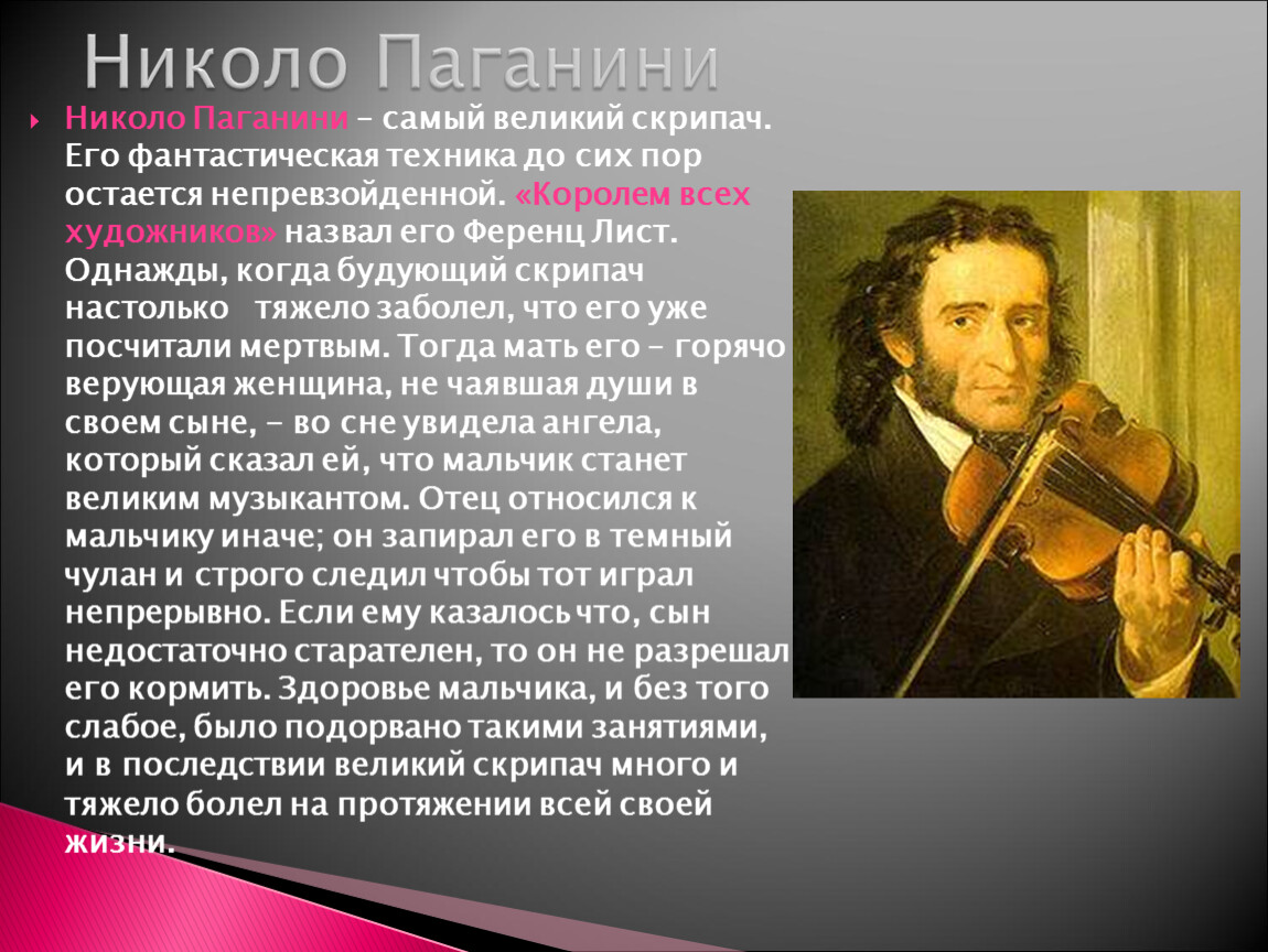 Николо Паганини – самый великий скрипач. Его фантастическая техника до сих пор остается непревзойденной. «Королем всех художников» назвал его Ференц Лист. Однажды, когда будующий скрипач настолько тяжело заболел, что его уже посчитали мертвым. Тогда мать его – горячо верующая женщина, не чаявшая души в своем сыне, - во сне увидела ангела, который сказал ей, что мальчик станет великим музыкантом. Отец относился к мальчику иначе; он запирал его в темный чулан и строго следил чтобы тот играл непрерывно. Если ему казалось что, сын недостаточно старателен, то он не разрешал его кормить. Здоровье мальчика, и без того слабое, было подорвано такими занятиями, и в последствии великий скрипач много и тяжело болел на протяжении всей своей жизни.