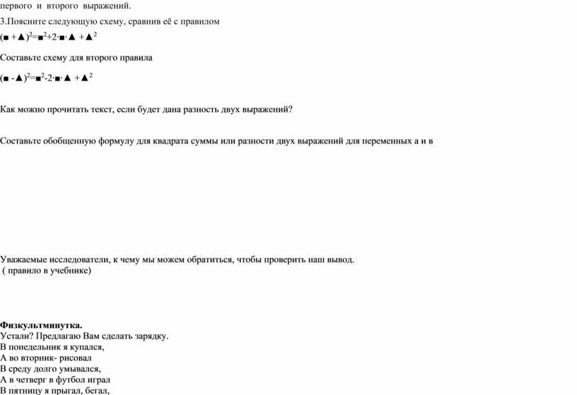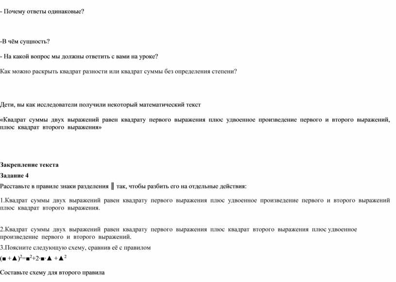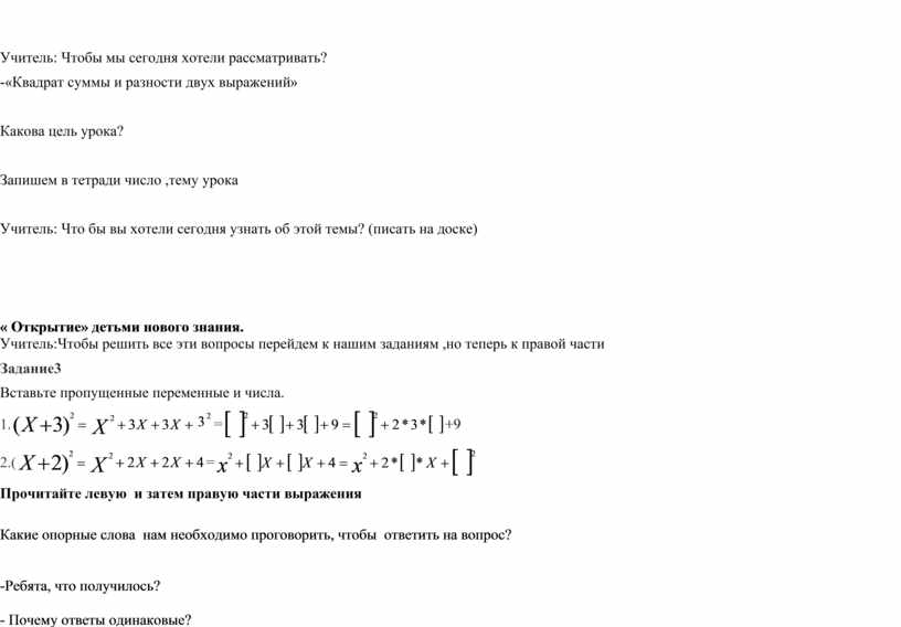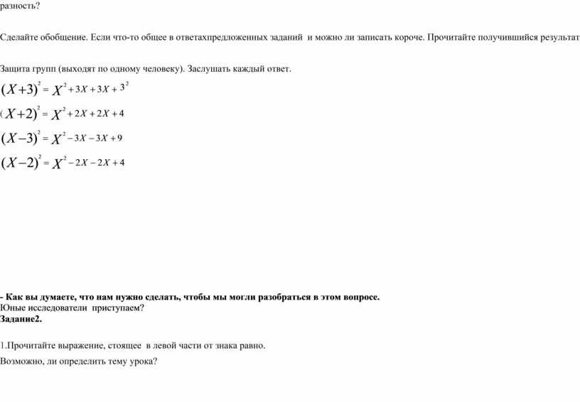Дети: «Квадрат суммы двух выражений» или «Квадрат разности двух выражений»