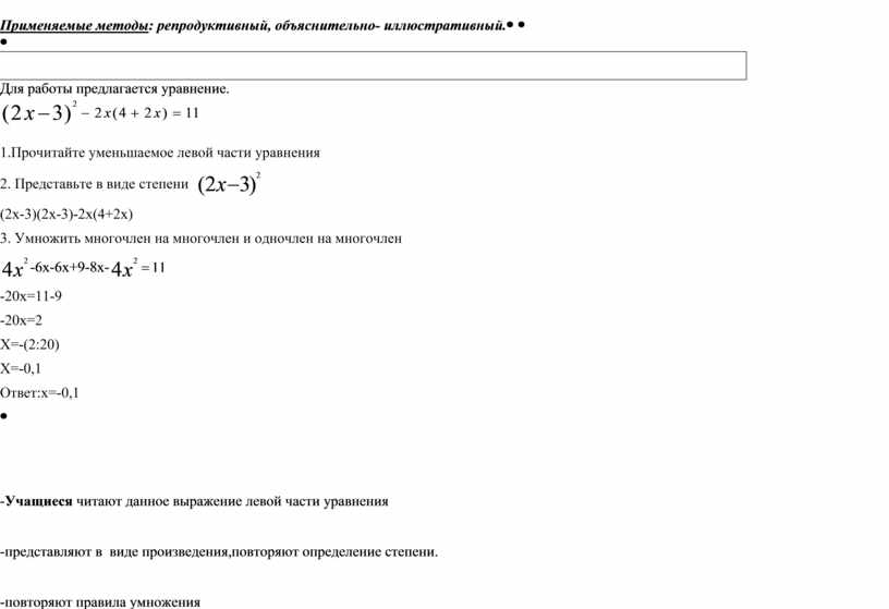 Применяемые методы: объяснительно-иллюстративный, репродуктивный.