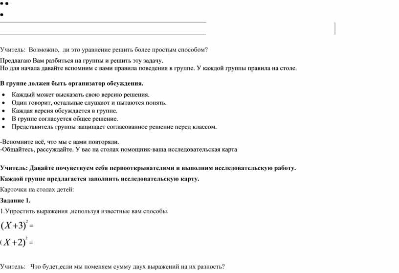 Раздаточный материал: чистые листы для построения алгоритма вывода формул сокращенного умножения, по 4–5 штук для каждой группы; правила работы в группе (распечатанные на листе); исследовательская карта для каждого учащегося