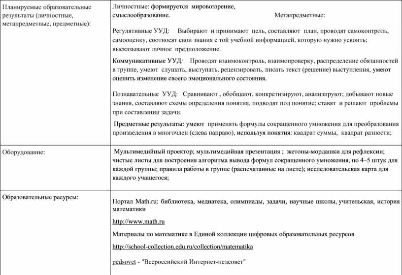 Личностные: формируется мировоззрение, смыслообразование. Метапредметные: Регулятивные УУД: Выбирают и принимают цель, составляют план, проводят самоконтроль, самооценку, соотносят свои знания с той учебной информацией, которую нужно усвоить; высказывают личное предположение. Коммуникативные УУД: Проводят взаимоконтроль, взаимопроверку, распределение обязанностей в группе, умеют слушать, выступать, рецензировать, писать текст (решение) выступления, умеют оценить изменение своего эмоционального состояния. Познавательные УУД: Сравнивают , обобщают, конкретизируют, анализируют; добывают новые знания, составляют схемы определения понятия, подводят под понятие; ставят и решают проблемы при составлении задачи. Предметные результаты: умеют применять формулы сокращенного умножения для преобразования произведения в многочлен (слева направо), используя понятия: квадрат суммы, квадрат разности; |