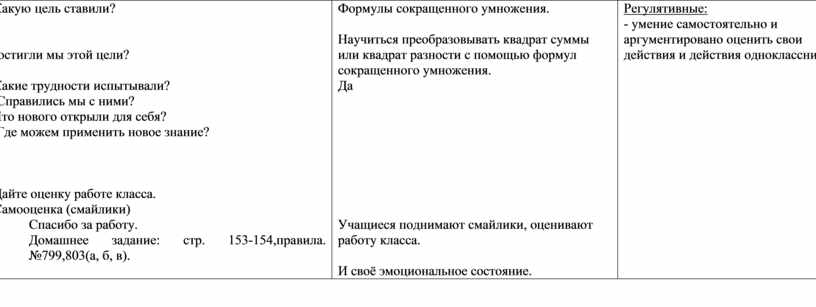 Технологическая карта урока по учебному предмету «Математика» в 7-ом классе на тему «Формулы сокращенного умножения».