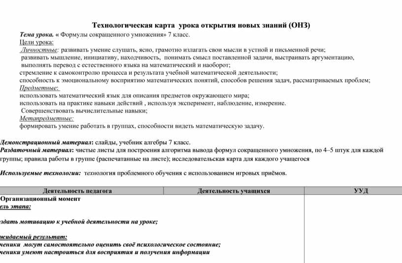 Технологическая карта урока открытия новых знаний (ОНЗ)