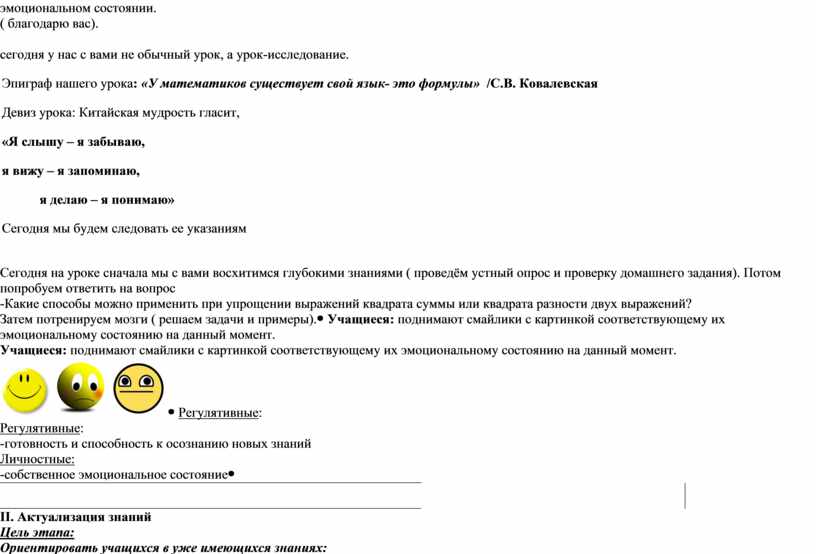 II. Актуализация знаний Цель этапа: Ориентировать учащихся в уже имеющихся знаниях: 1) повторить чтение математических выражений, представление квадрата суммы или разности виде степени, умножение многочлена на многочлен и одночлена на многочлен. 2) тренировать мыслительные операции: анализ, сравнение, обобщение на примере математических действий;