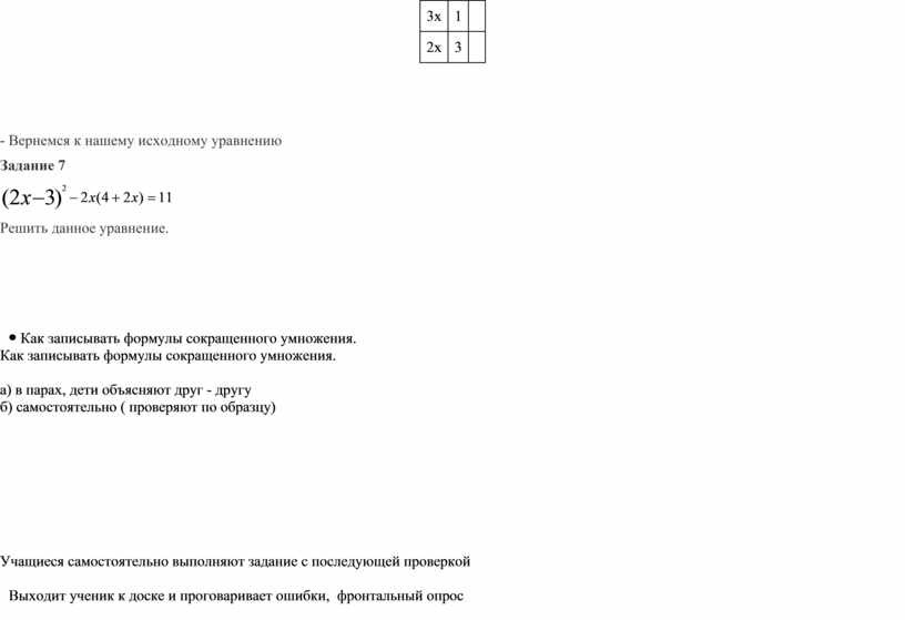 IV. Первичное закрепление Цель этапа: -организовать самопроверку и самооценку учащимися умения применять формулы сокращенного умножения -закрепить знание нового правила путём решения задач, работая в паре и самостоятельно