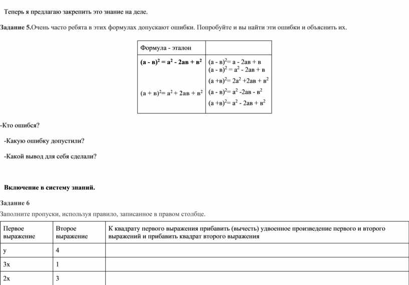 Составьте обобщенную формулу для квадрата суммы или разности двух выражений для переменных а и в