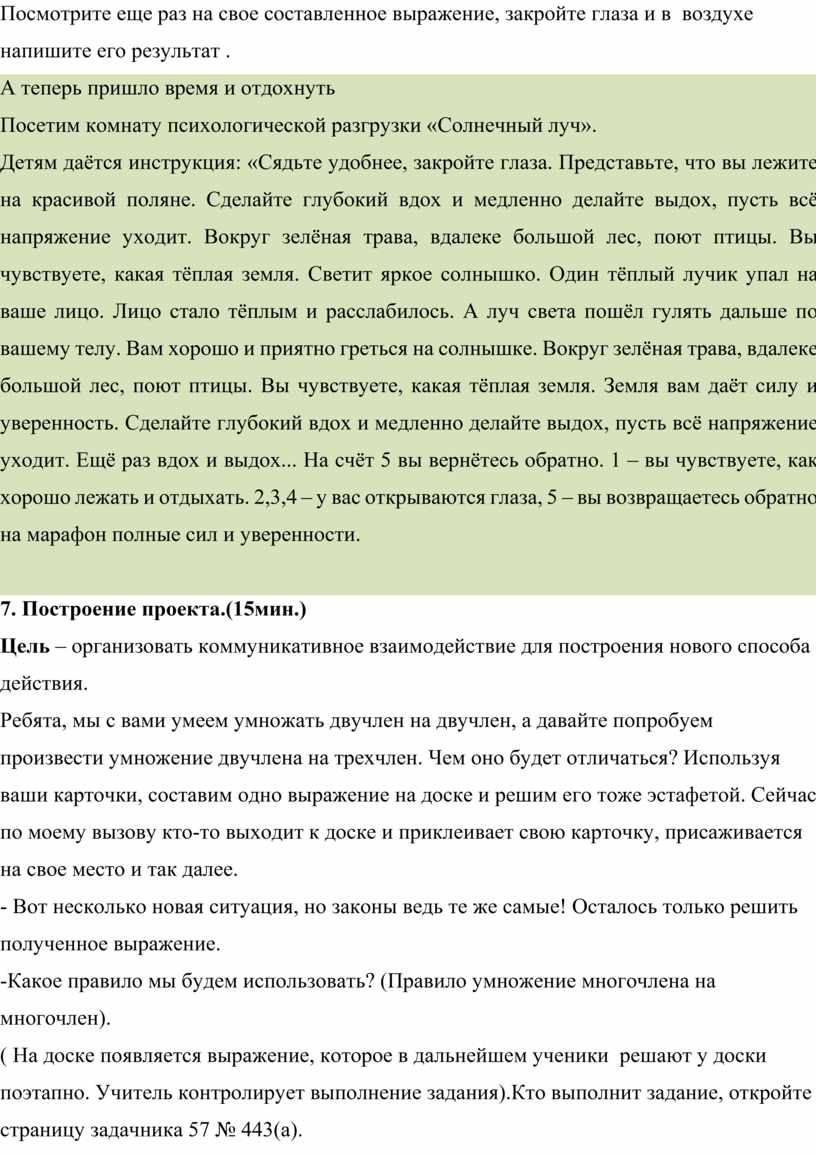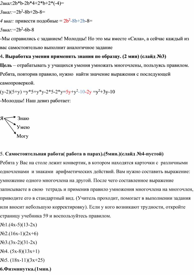 Ребята у Вас на столе лежит конвертик, в котором находятся карточки с различными одночленами и знаками арифметических действий. Вам нужно составить выражение: умножение одного многочлена на другой. После чего составленное выражение записываете в свою тетрадь и применив правило умножения многочлена на многочлен, приводите его в стандартный вид. (Учитель проходит, помогает в выполнении задания или вносит небольшую корректировку). Если у кого возникают трудности, откройте страницу учебника 59 и воспользуйтесь правилом.