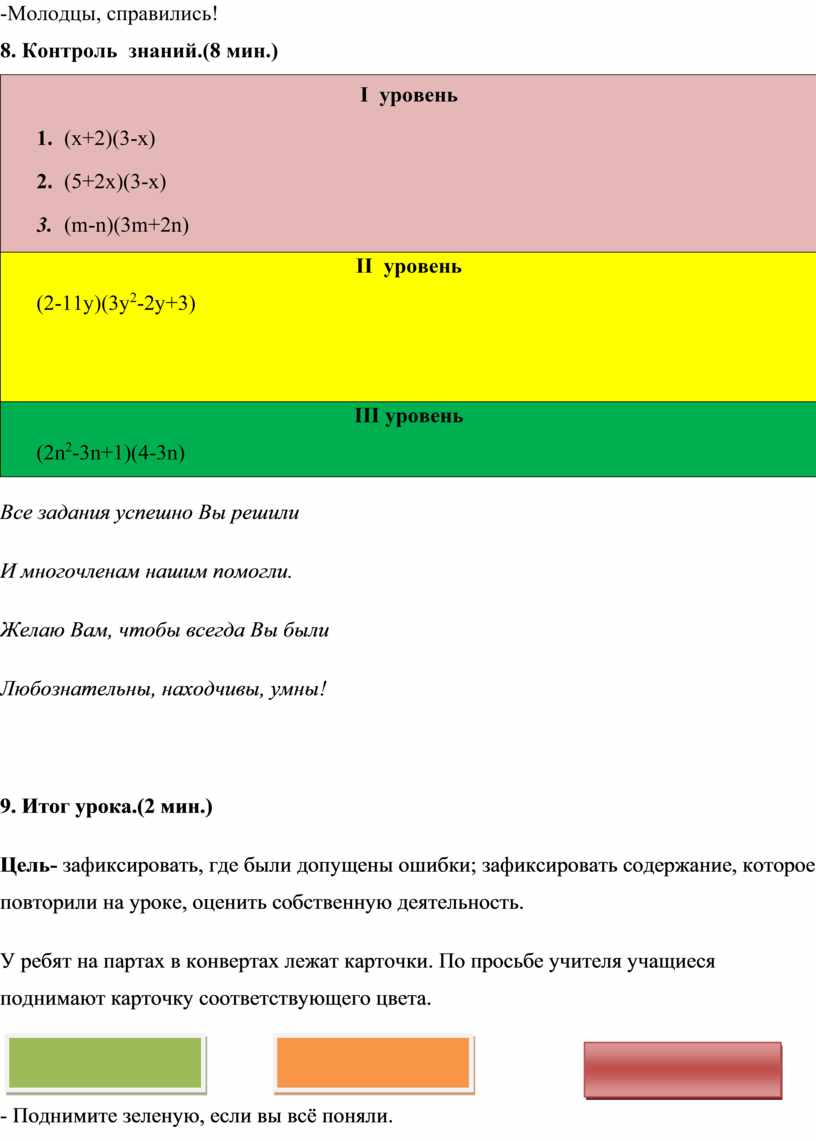 I уровень 1. (x+2)(3-x) 2. (5+2x)(3-x) 3. (m-n)(3m+2n) |
