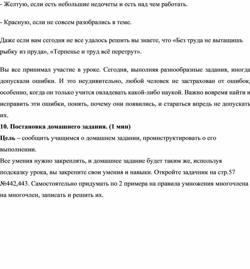 Все умения нужно закреплять, и домашнее задание будет таким же, используя подсказку урока, вы закрепите свои умения и навыки. Откройте задачник на стр.57 №442,443. Самостоятельно придумать по 2 примера на правила умножения многочлена на многочлен, записать и решить их.