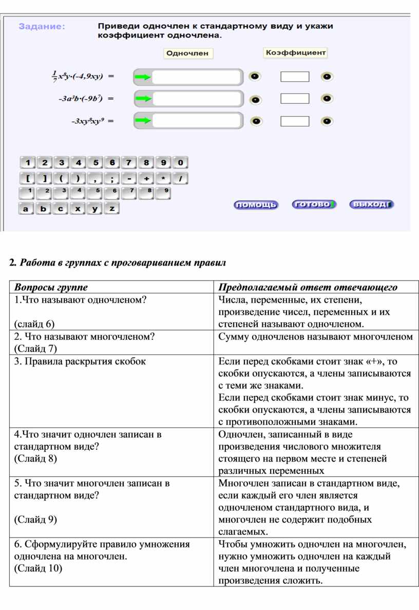 Опрос по теории с целью повторить правила по теме «Умножение одночлена на многочлен».