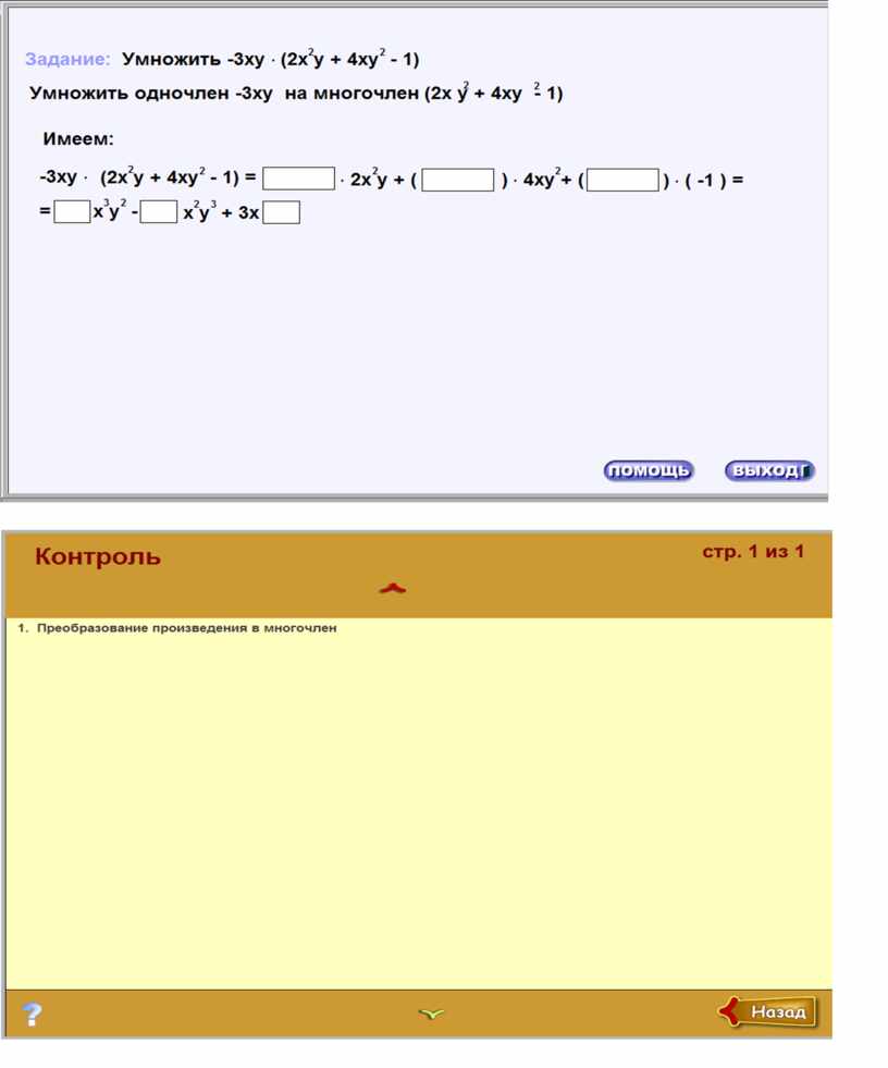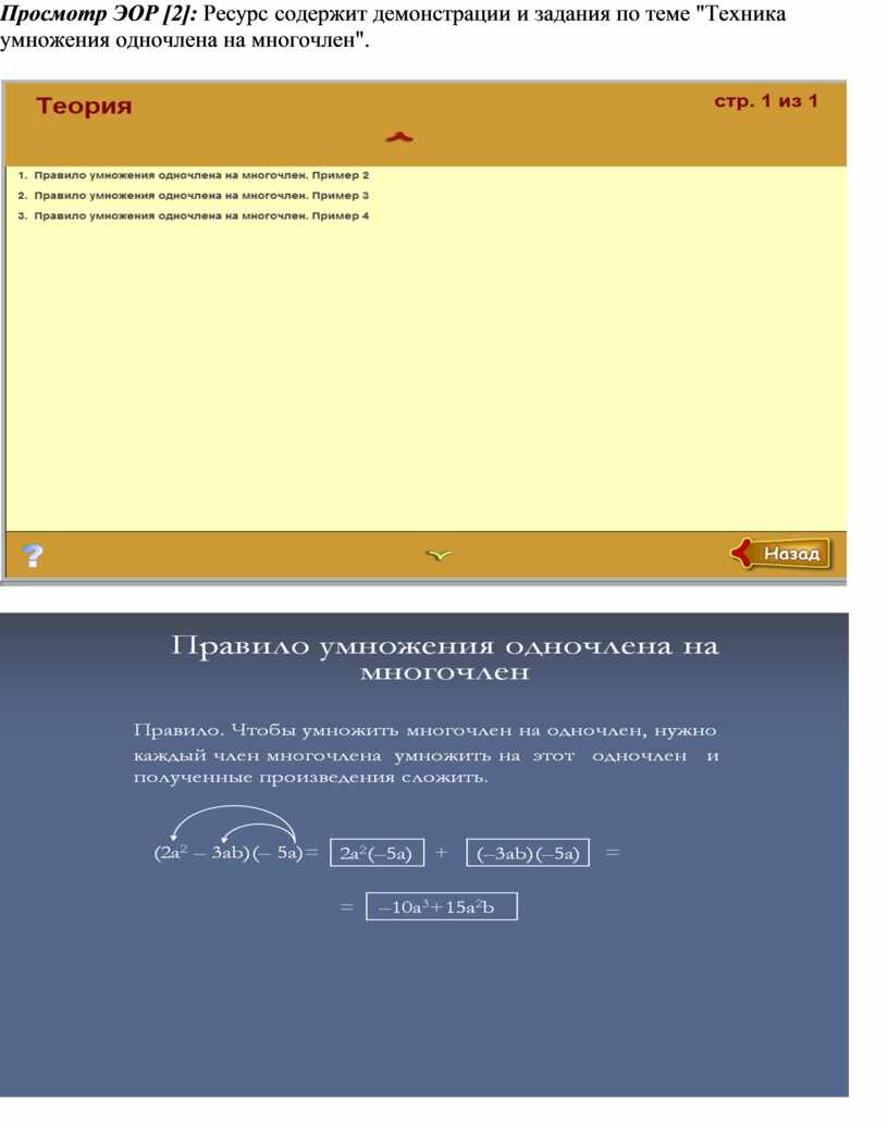 Просмотр ЭОР [2]: Ресурс содержит демонстрации и задания по теме "Техника умножения одночлена на многочлен".