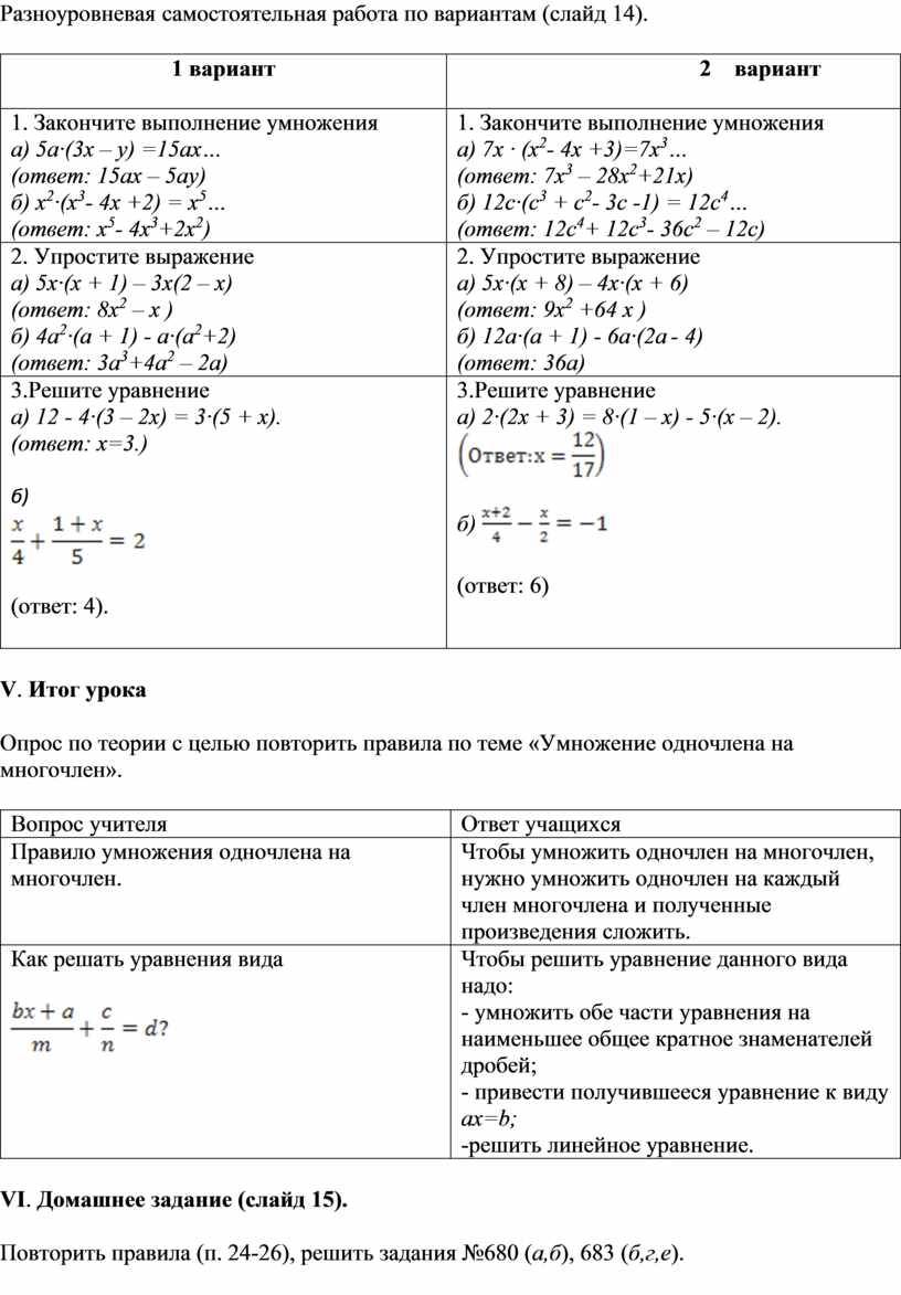 Учащиеся должны уметь проговаривать действия умножения одночлена на многочлен, приведение многочлена к стандартному виду. Уметь выполнять эти действия.