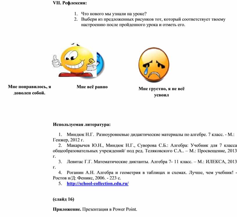 2. Макарычев Ю.Н., Миндюк Н.Г., Суворова С.Б.: Алгебра: Учебник для 7 класса общеобразовательных учреждений/ под ред. Теляковского С.А.. – М.: Просвещение, 2013 г.