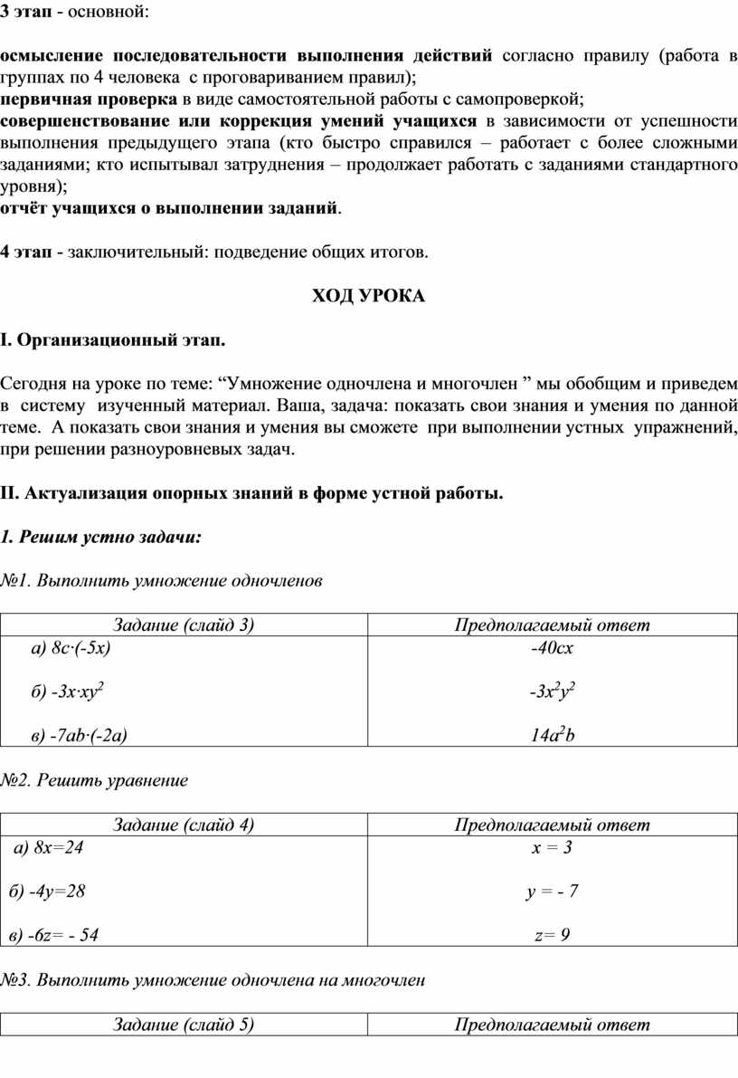 2 этап - подготовительный: актуализация опорных знаний, необходимых для освоения правила умножения одночлена на многочлен – это свойство степени, правило приведения подобных слагаемых и само правило умножения одночлена на многочлен.