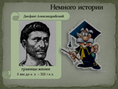 - Это Диофант Александрийский. О подробностях его жизни практически ничего не известно. С одной стороны, Диофант цитирует Гипсикла (II век до н. э.); с другой стороны, о Диофанте пишет Теон Александрийский(около 350 года н. э.), — откуда можно сделать вывод, что его жизнь протекала в границах этого периода. Возможное уточнение времени жизни Диофанта основано на том, что его Арифметика посвящена «достопочтеннейшему Дионисию». Полагают, что этот Дионисий — не кто иной, как епископ Дионисий Александрийский, живший в середине III в. н. э. В Палатинской антологии содержится эпиграмма-задача, с помощью которой можно подсчитать, сколько лет прожил Диофант. Над этой задачей я предлагаю вам поработать дома.