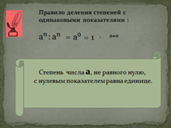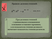 - Давайте запишем следующее правило. Правило деления степеней с одинаковыми основаниями.