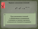 - Что же нужно сделать, если нам необходимо умножить два числа с одинаковыми основаниями, но разными показателями степени? Учитель подводит итог.