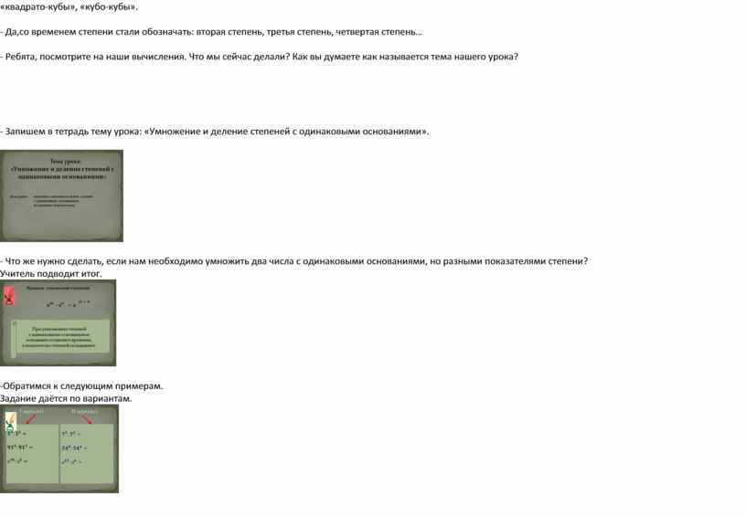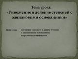 Тема урока: Умножение и деление степеней с одинаковыми основаниями.