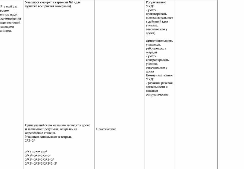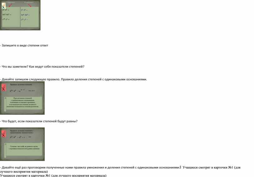 Учащиеся пытаются сформулировать правило умножения степеней и записать в тетрадь.