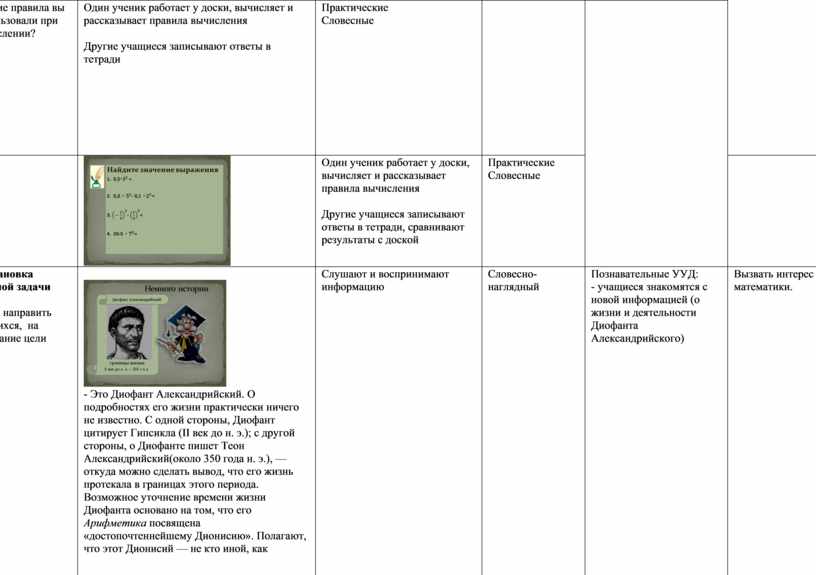 Познавательные УУД: - учащиеся знакомятся с новой информацией (о жизни и деятельности Диофанта Александрийского) |