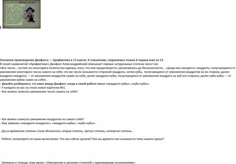 Основное произведение Диофанта — Арифметика в 13 книгах. К сожалению, сохранились только 6 первых книг из 13. В своей знаменитой «Арифметике» Диофант Александрийский описывает первые натуральные степени чисел так: «Все числа… состоят из некоторого количества единиц; ясно, что они продолжаются, увеличиваясь до бесконечности. …среди них находятся: квадраты, получающиеся от умножения некоторого числа самого на себя; это же число называется стороной квадрата, затем кубы, получающиеся от умножения квадратов на их сторону, далее квадрато-квадраты — от умножения квадратов самих на себя, далее квадрато-кубы, получающиеся от умножения квадрата на куб его стороны, далее кубо-кубы — от умножения кубов самих на себя». - Давайте разберемся, что имел ввиду Диофант, когда в своей работе писал «квадрато-кубы», «кубо-кубы». - У каждого из вас на столе лежат карточки №1. - Как можно записать умножение числа самого на себя?