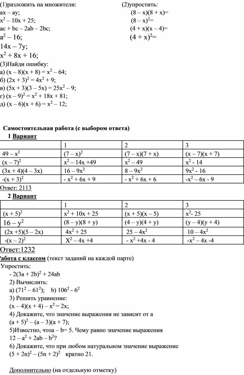 1. Изучить основные понятия, правила, необходимые для усвоения темы «Применение формул сокращенного умножения»