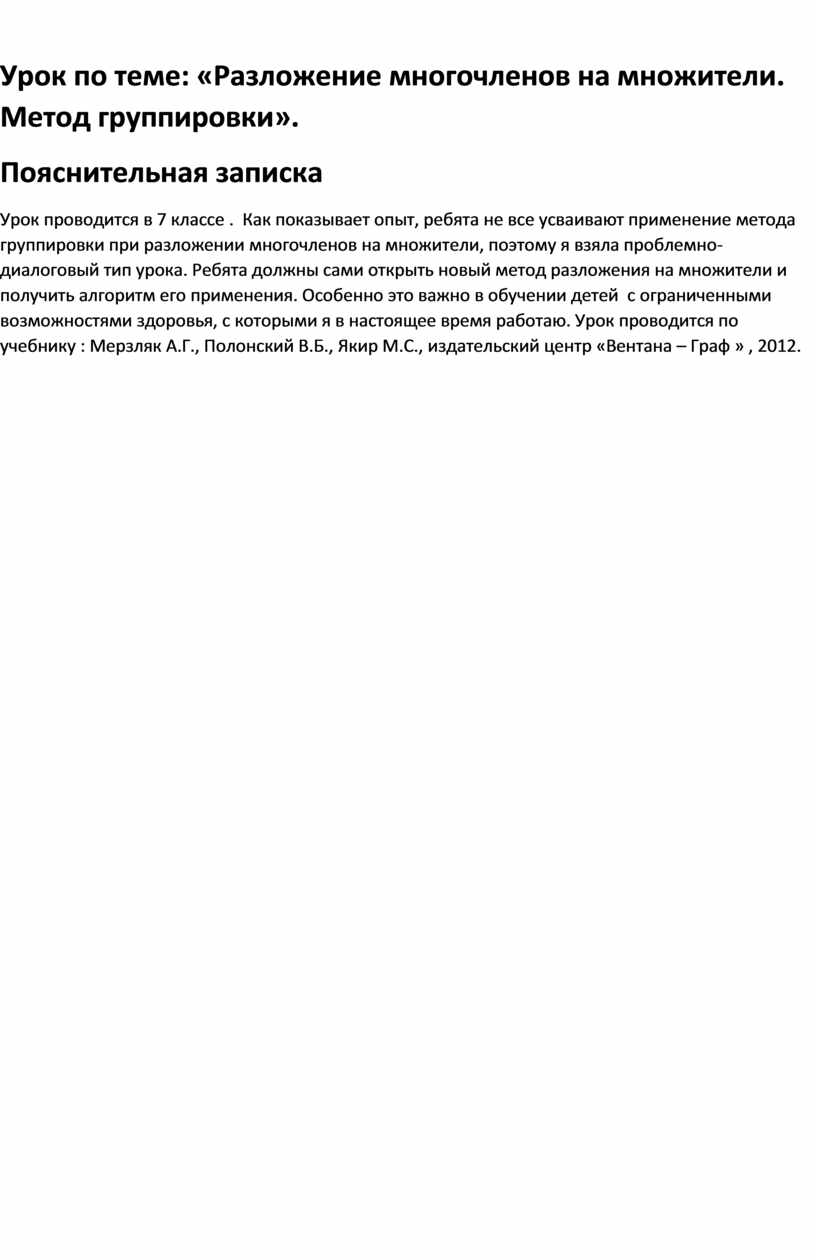 Урок проводится в 7 классе . Как показывает опыт, ребята не все усваивают применение метода группировки при разложении многочленов на множители, поэтому я взяла проблемно- диалоговый тип урока. Ребята должны сами открыть новый метод разложения на множители и получить алгоритм его применения. Особенно это важно в обучении детей с ограниченными возможностями здоровья, с которыми я в настоящее время работаю. Урок проводится по учебнику : Мерзляк А.Г., Полонский В.Б., Якир М.С., издательский центр «Вентана – Граф » , 2012.