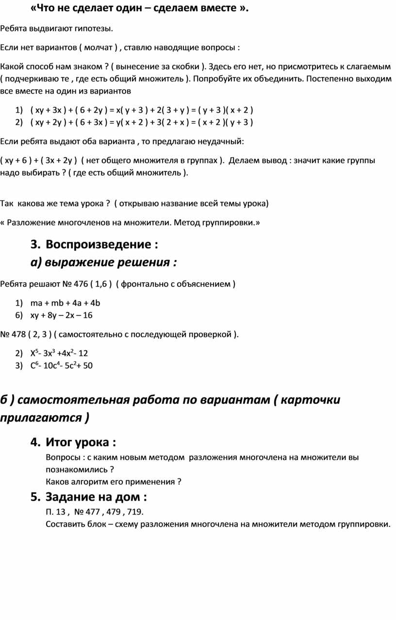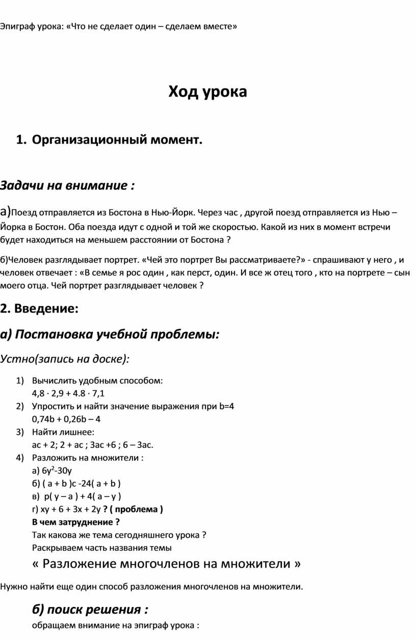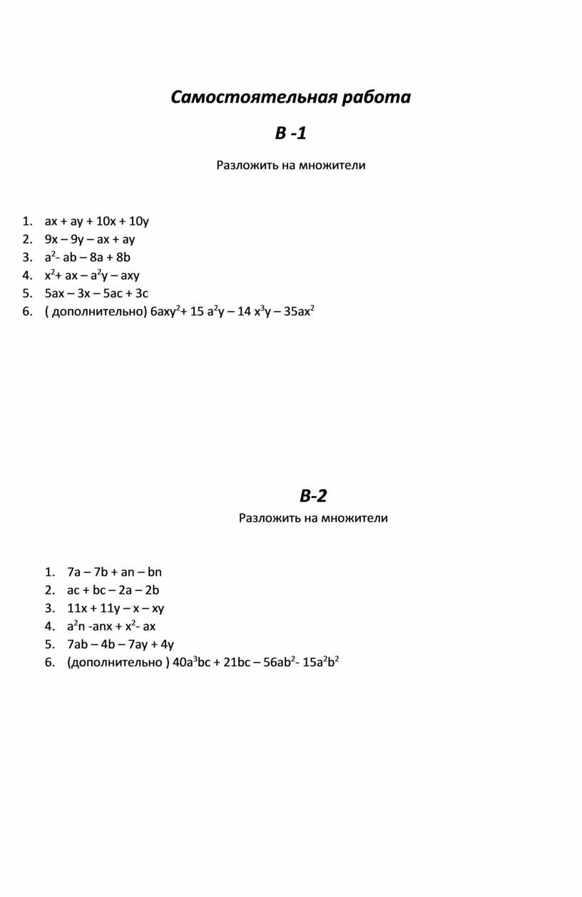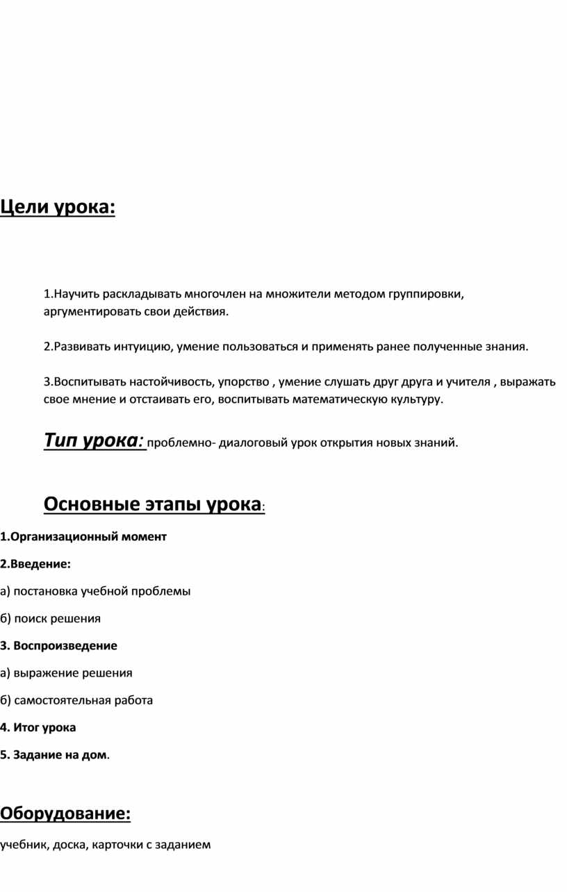 Урок по теме: «Разложение многочленов на множители. Метод группировки».