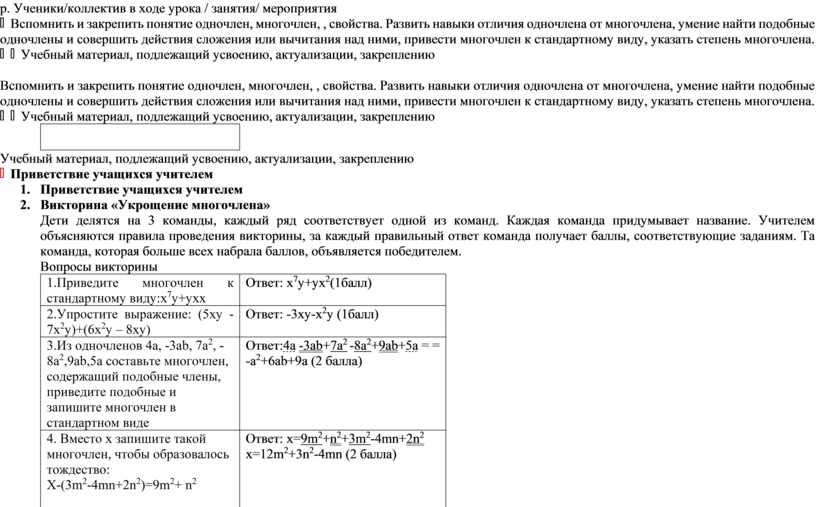 Вспомнить и закрепить понятие одночлен, многочлен, , свойства. Развить навыки отличия одночлена от многочлена, умение найти подобные одночлены и совершить действия сложения или вычитания над ними, привести многочлен к стандартному виду, указать степень многочлена. |