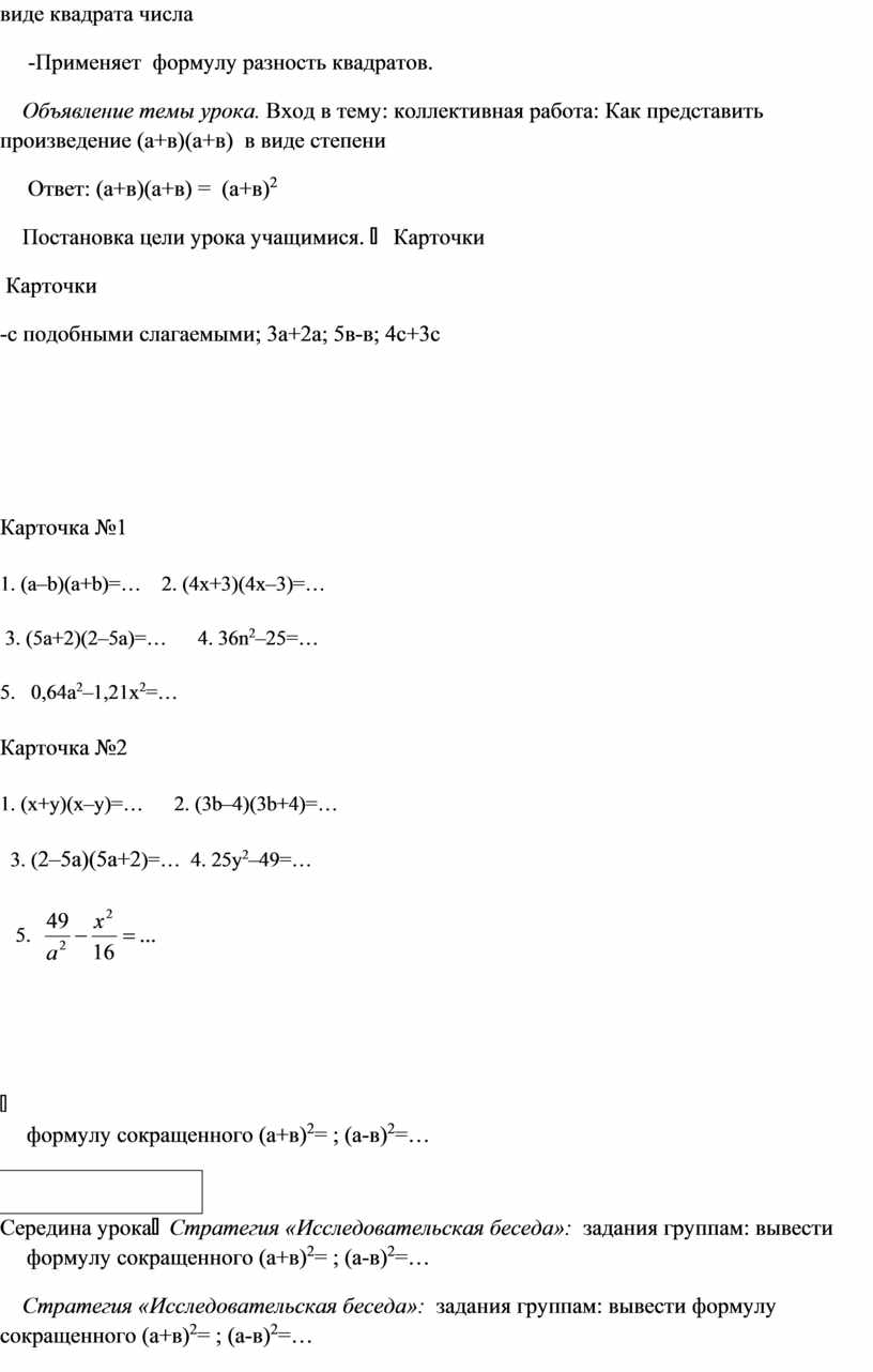 Стратегия «Исследовательская беседа»: задания группам: вывести формулу сокращенного (а+в)2= ; (а-в)2=… Обратная связь. Стратегия: «Поднятая рука» – защита – стратегия: «Галерея» Оценивание: Стратегия: «Уточняющие вопросы». Дескрипторы оценивания: 1. Объясняет преобразования при выводе формулы. 2. Правильно произносит математические термины. 3. Правильно составляет предложения при формулировании правила.