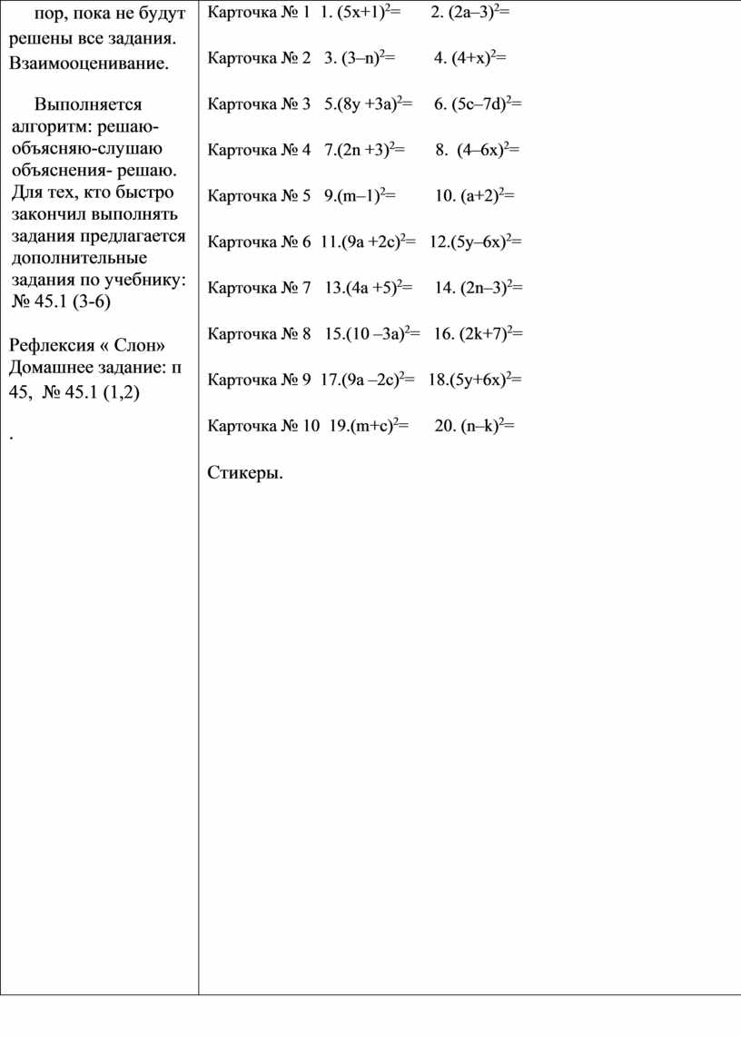 Карточка № 1 1. (5x+1)2= 2. (2a–3)2= Карточка № 2 3. (3–n)2= 4. (4+x)2= Карточка № 3 5.(8y +3a)2= 6. (5c–7d)2= Карточка № 4 7.(2n +3)2= 8. (4–6x)2= Карточка № 5 9.(m–1)2= 10. (a+2)2= Карточка № 6 11.(9a +2c)2= 12.(5y–6x)2= Карточка № 7 13.(4a +5)2= 14. (2n–3)2= Карточка № 8 15.(10 –3a)2= 16. (2k+7)2= Карточка № 9 17.(9a –2c)2= 18.(5y+6x)2= Карточка № 10 19.(m+c)2= 20. (n–k)2= Стикеры.