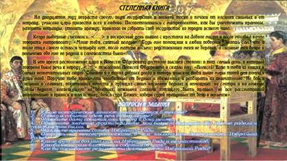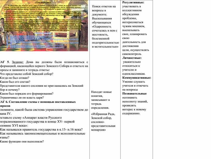 · Как характеризуется «боярское правление»? · В чём автор видит главный вред подобного правления? · Какие последствия оно имело? · Каким образом обстановка начала правления Ивана IV могла повлиять на формирование его личности? · Какие черты личности Ивана IV привлекательны для вас, а какие нет? Почему? · Иван IV стал первым в истории России «боговенчанным царём». Что это означает? Шаг 4. Рассказ об Избранной Раде и Земском Соборе. Расскажите об Избранной раде. Опираясь на отрывок из Степенной книги, объясните, в чем заключалась деятельность Избранной Рады? Какова была роль ближайших советников царя? Как вы оцениваете её деятельность?