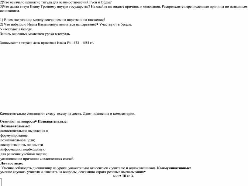 Иван Грозный - самый загадочный и самый жестокий царь на Руси, был высокообразованным и просвещенным человеком. Он оставил в истории свой неизгладимый след. На 17 году жизни Иван заявил митрополиту Макарию о своем намерении венчаться на царство. Это было новшество. До Ивана IV венчали на великое княжение. Так Иван IV стал первым из русских царей, получивших этот титул. ШАГ 2. Составить схему «Причины венчания Ивана IV на царство». Предлагаю вам составить схему. Для этого ответьте на вопросы: 1)Как вы думаете, какое значение для внешней политики могло иметь принятие Иваном IV царского титула? 2)Что означало принятие титула для взаимоотношений Руси и Орды? 3)Что давал титул Ивану Грозному внутри государства? На слайде вы видите причины и основания. Распределите перечисленные причины по названным основаниям.