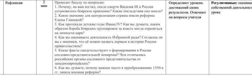 Проводит беседу по вопросам: 1. Почему, на ваш взгляд, после смерти Василия III в России установилось боярское правление? Какие последствия оно имело? 2. Какое значение для централизации страны имели реформы Елены Глинской? 3. Как протекали детские годы Ивана IV? Как вы думаете, каким образом борьба боярских группировок за власть могла отразиться на личности царя? 4. Как вы оцениваете деятельность Избранной рады? Согласны ли вы с мнением, что её можно назвать первым в истории России правительством? 5. Какие факты свидетельствуют о формировании в России сословно-представительной монархии? Чем отличались российские органы сословного представительства от западноевропейских? 6. Как вы думаете, почему важное место в преобразованиях 1550-х гг. заняла военная реформа? |