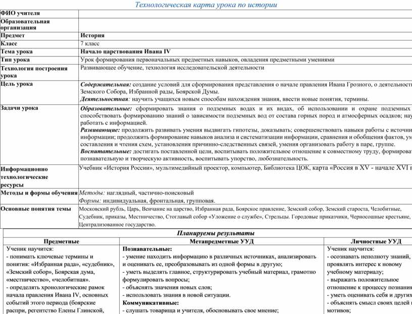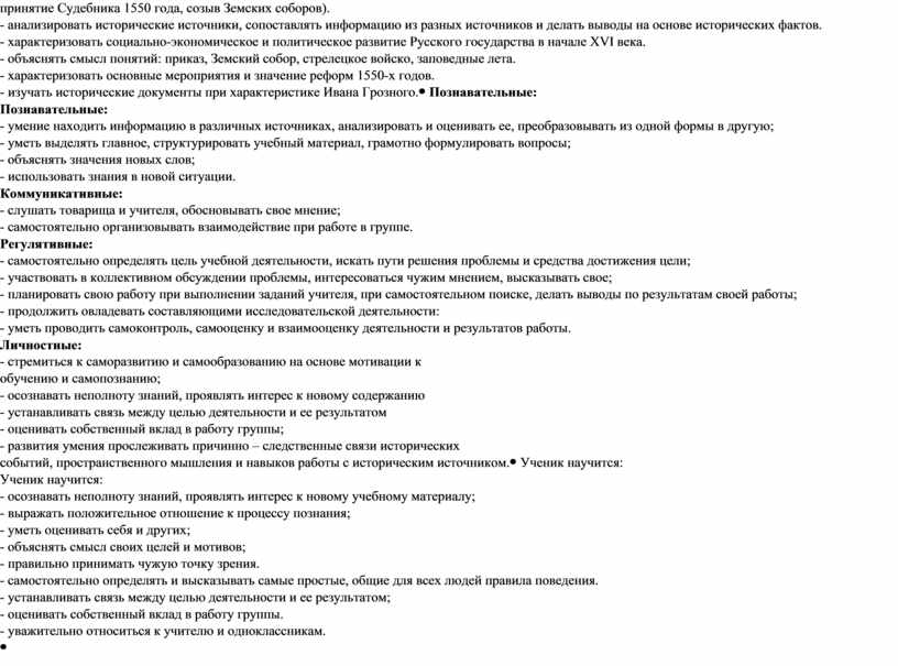 Ученик научится: - понимать ключевые термины и понятия: «Избранная рада», «судебник», «Земский собор», Боярская дума, «местничество», «челобитная». - определять хронологические рамок начала правления Ивана IV, основных событий этого периода (боярские распри, регентство Елены Глинской, принятие Судебника 1550 года, созыв Земских соборов). - анализировать исторические источники, сопоставлять информацию из разных источников и делать выводы на основе исторических фактов. - характеризовать социально-экономическое и политическое развитие Русского государства в начале XVI века. - объяснять смысл понятий: приказ, Земский собор, стрелецкое войско, заповедные лета. - характеризовать основные мероприятия и значение реформ 1550-х годов. - изучать исторические документы при характеристике Ивана Грозного. |