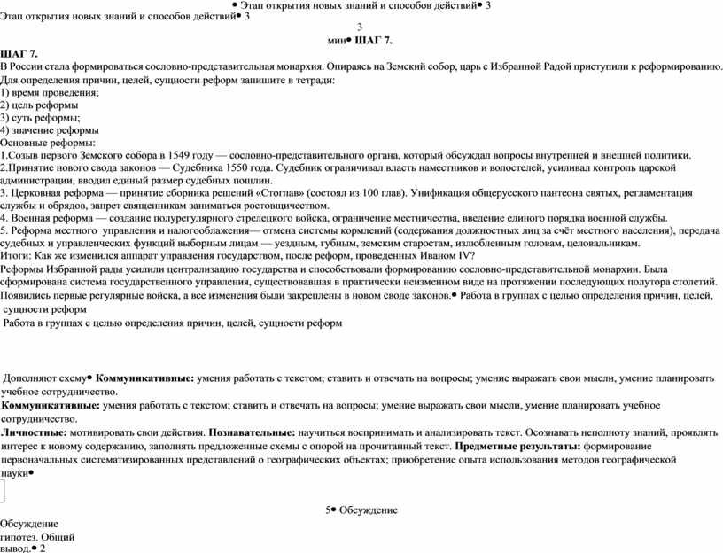 ШАГ 7. В России стала формироваться сословно-представительная монархия. Опираясь на Земский собор, царь с Избранной Радой приступили к реформированию. Для определения причин, целей, сущности реформ запишите в тетради: 1) время проведения; 2) цель реформы 3) суть реформы; 4) значение реформы Основные реформы: 1.Созыв первого Земского собора в 1549 году — сословно-представительного органа, который обсуждал вопросы внутренней и внешней политики. 2.Принятие нового свода законов — Судебника 1550 года. Судебник ограничивал власть наместников и волостелей, усиливал контроль царской администрации, вводил единый размер судебных пошлин. 3. Церковная реформа — принятие сборника решений «Стоглав» (состоял из 100 глав). Унификация общерусского пантеона святых, регламентация службы и обрядов, запрет священникам заниматься ростовщичеством. 4. Военная реформа — создание полурегулярного стрелецкого войска, ограничение местничества, введение единого порядка военной службы. 5. Реформа местного управления и налогооблажения— отмена системы кормлений (содержания должностных лиц за счёт местного населения), передача судебных и управленческих функций выборным лицам — уездным, губным, земским старостам, излюбленным головам, целовальникам. Итоги: Как же изменился аппарат управления государством, после реформ, проведенных Иваном IV? Реформы Избранной рады усилили централизацию государства и способствовали формированию сословно-представительной монархии. Была сформирована система государственного управления, существовавшая в практически неизменном виде на протяжении последующих полутора столетий. Появились первые регулярные войска, а все изменения были закреплены в новом своде законов. |