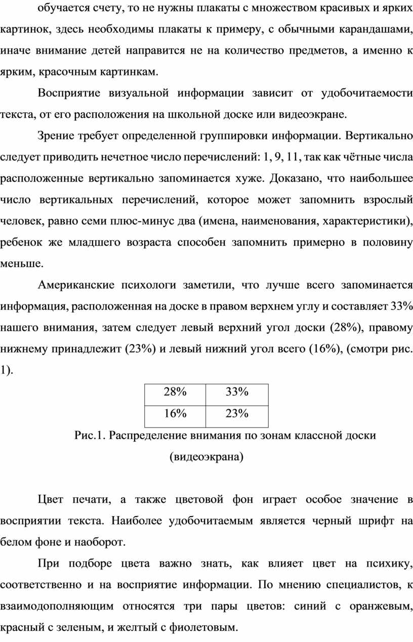 Американские психологи заметили, что лучше всего запоминается информация, расположенная на доске в правом верхнем углу и составляет 33% нашего внимания, затем следует левый верхний угол доски (28%), правому нижнему принадлежит (23%) и левый нижний угол всего (16%), (смотри рис. 1).
