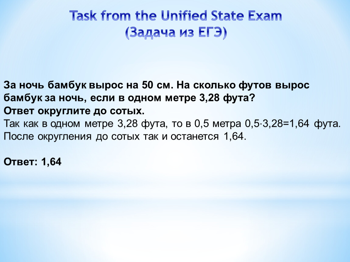 За ночь бамбук вырос на 50 см. На сколько футов вырос бамбук за ночь, если в одном метре 3,28 фута?