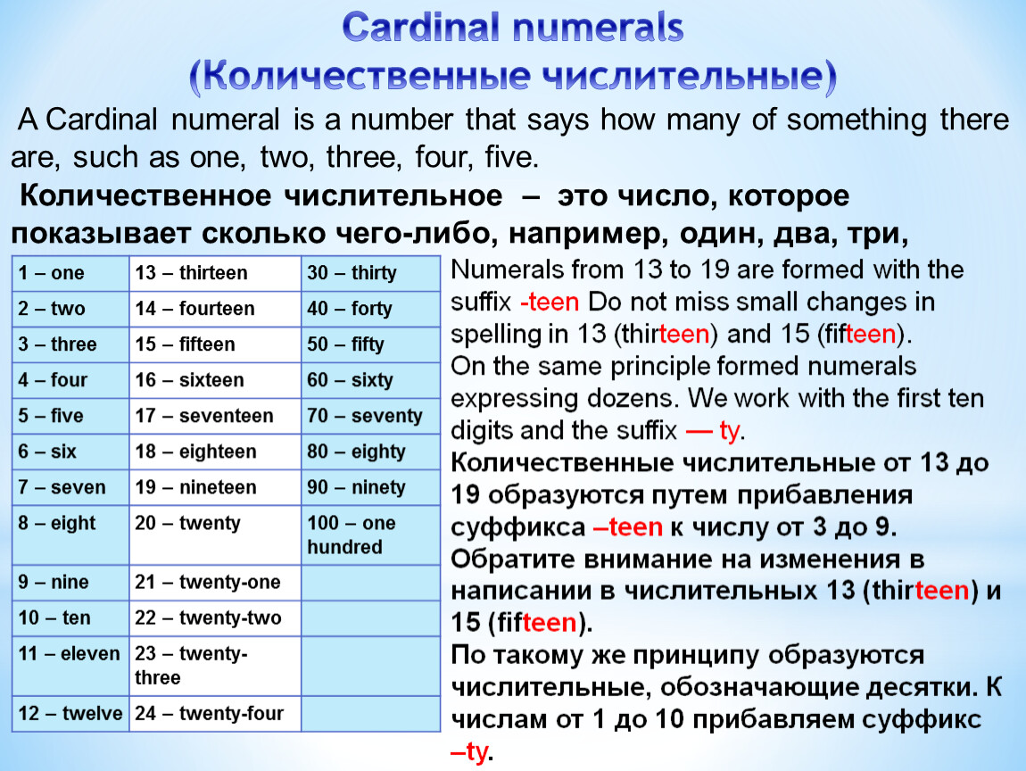 Количественные числительные от 13 до 19 образуются путем прибавления суффикса –teen к числу от 3 до 9. Обратите внимание на изменения в написании в числительных 13 (thirteen) и 15 (fifteen).